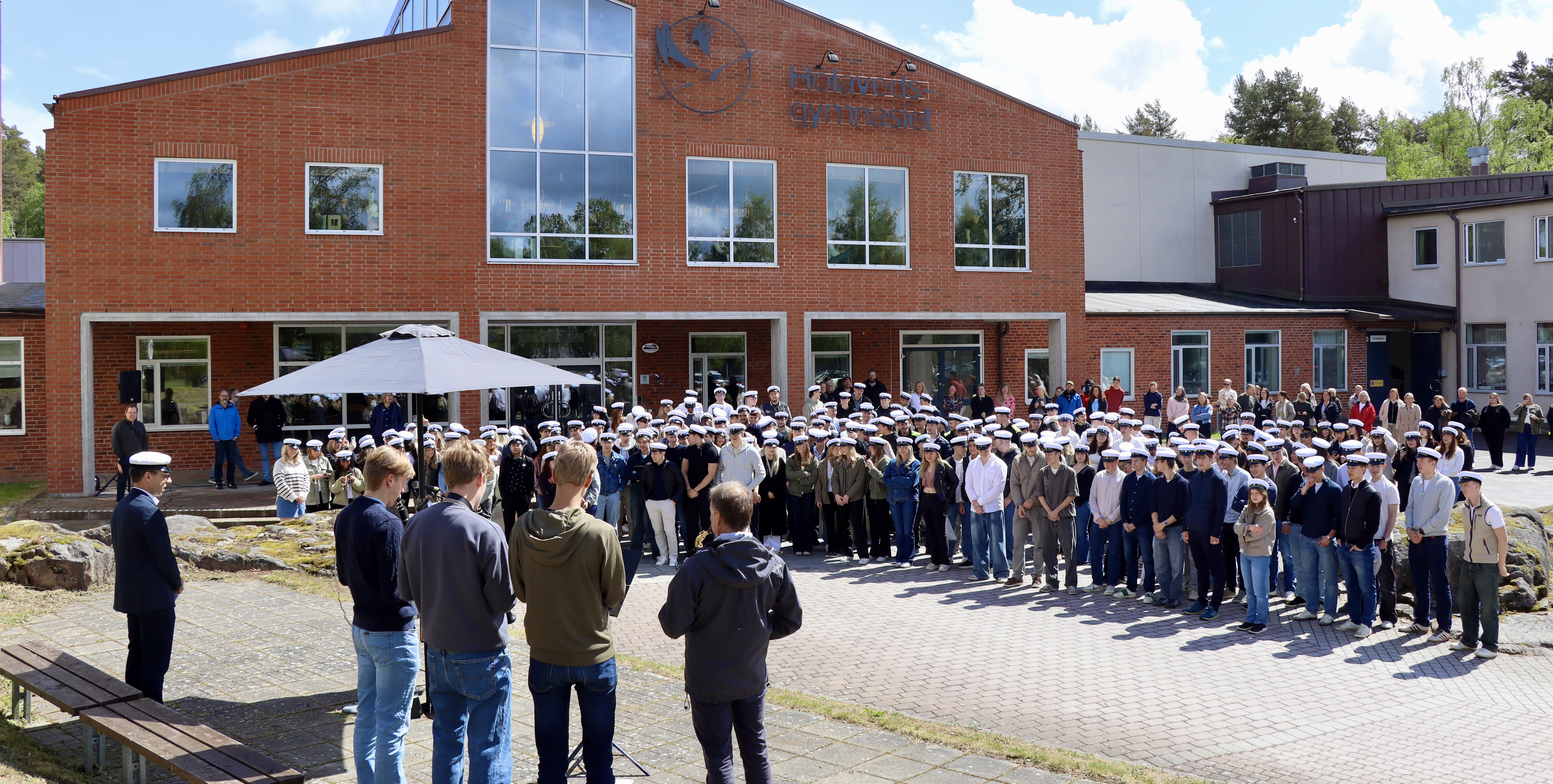 Klockan 13.30 samlades de förväntansfulla och fint klädda eleverna tillsammans med lärare och annan personal vid skolans huvudentré. Regnet som föll precis innan starten avtog, och istället kikade solen fram. Rektor Stefan Carlswärd höll ett peppande tal till eleverna. Efter ett gemensamt hurra placerades mössorna på huvudet, följt av en fanfar. Därefter sjöngs Studentsången – en sång som kommer att höras flera gånger under de kommande veckorna.