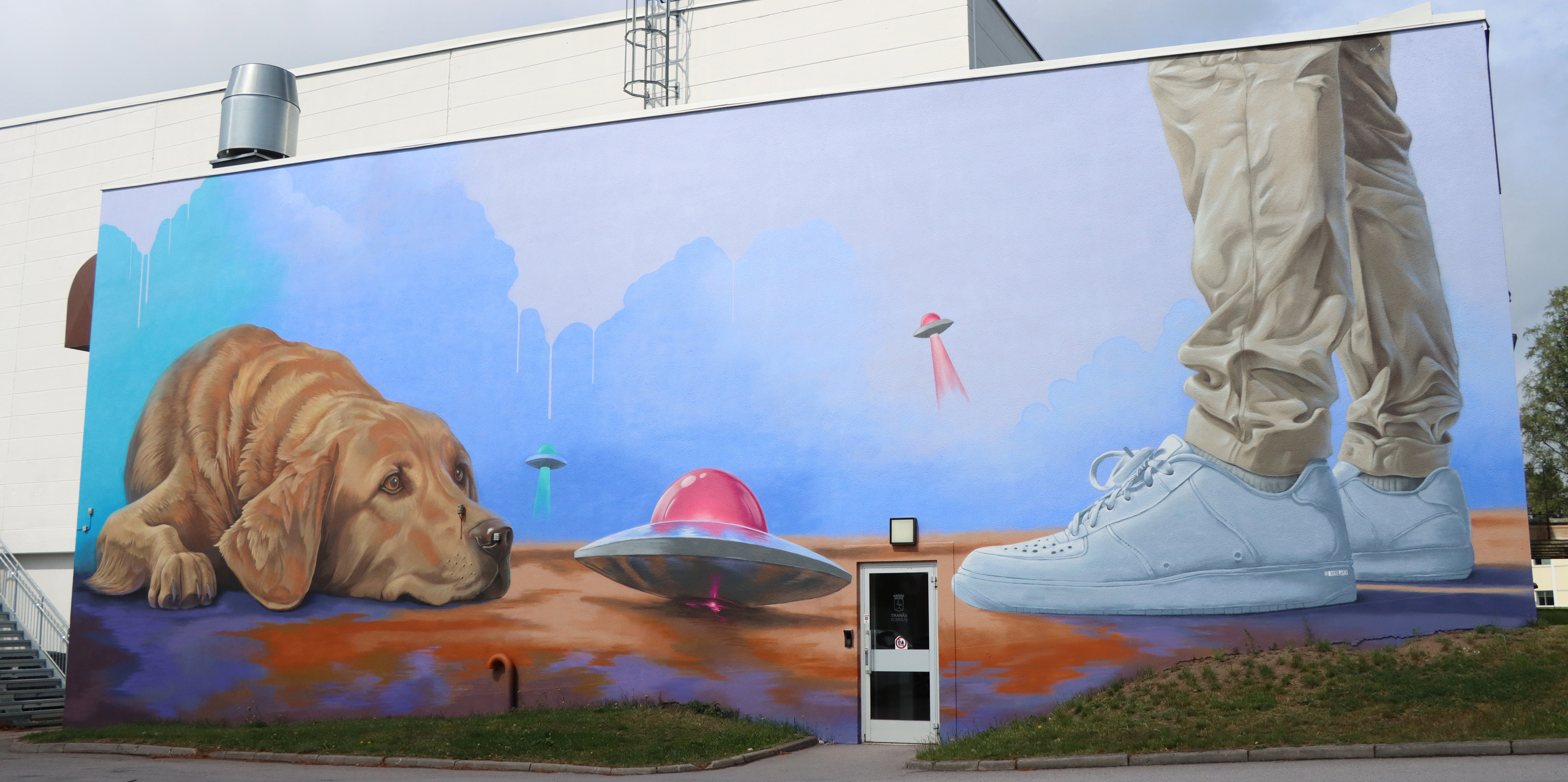 På idrottshuset (Frejavägen 2) skapades en målning föreställande en hund och rymdskepp, målad i surrealistisk stil. Fastighetsägare AB Tranåsbostäder. Konstnär: Wosk från Storbritannien.